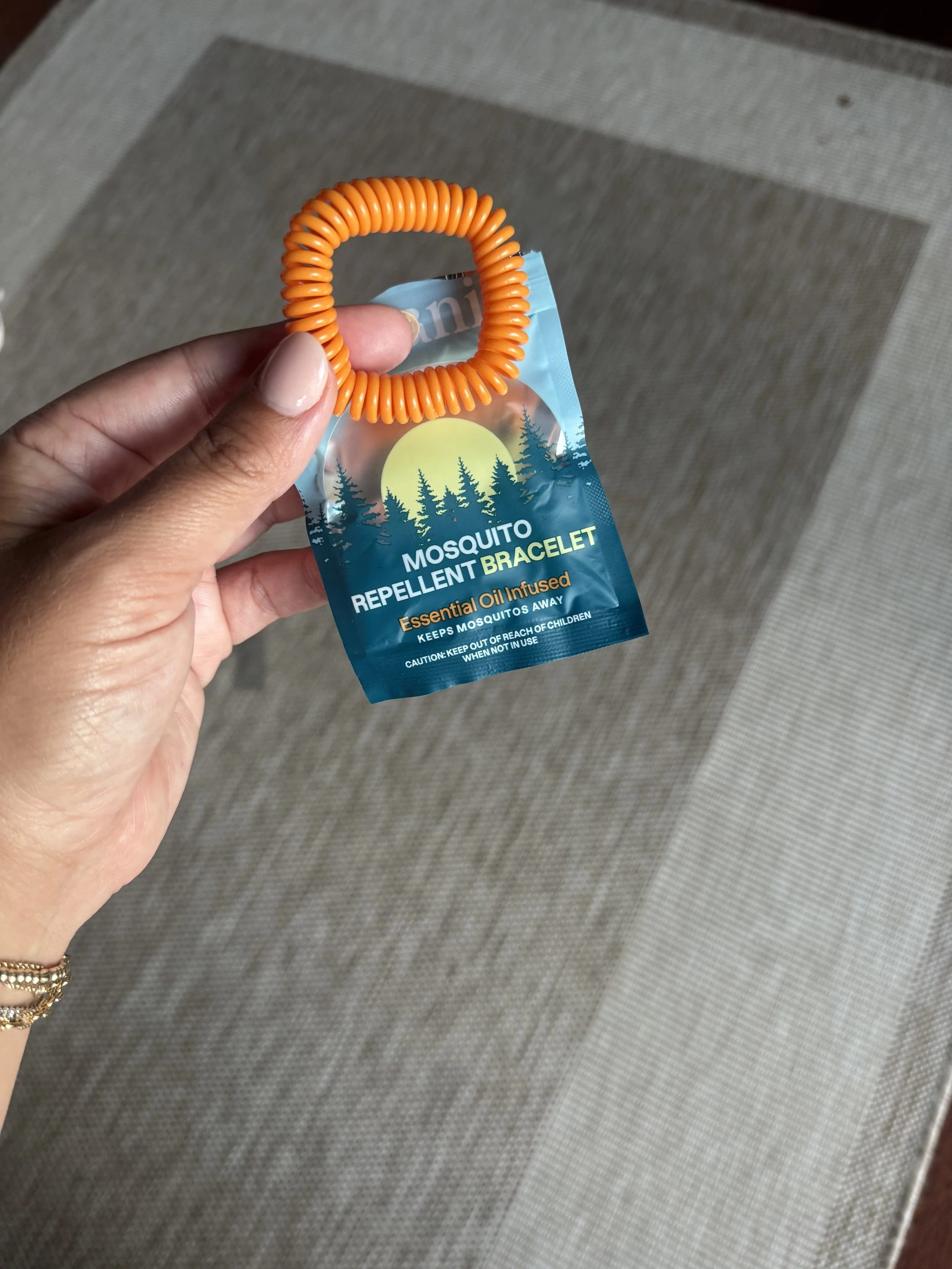 Mosquito repellent bracelets that I packed with his clothes for extra scent transfer (bonus: he thought they were a toy).