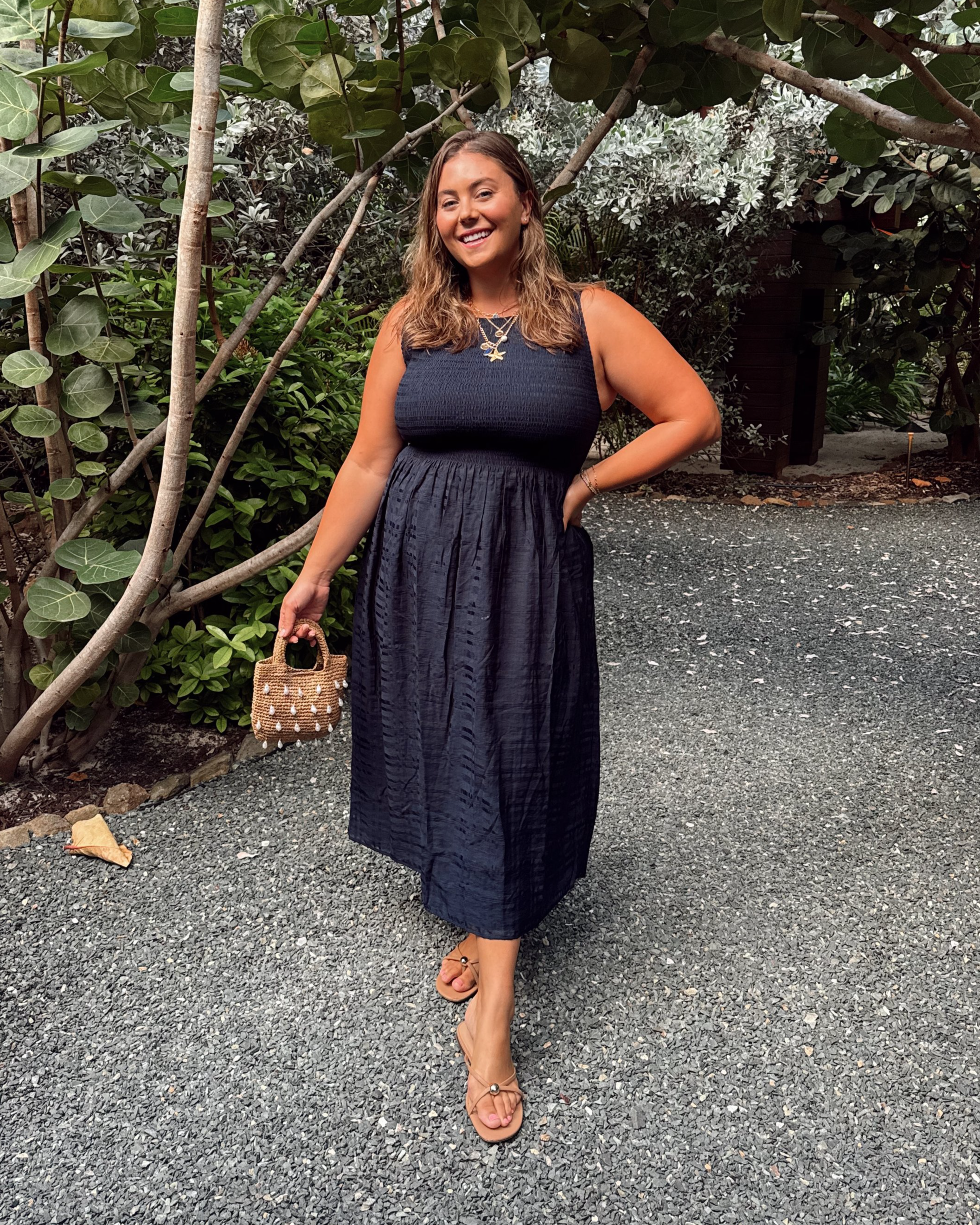 Evenings in the BVIs are very relaxed, but that doesn’t mean you can’t show up a little elevated. I packed a few easy, breezy dresses (mostly maxi length for toddler-chasing purposes) and paired them with comfy flat sandals like these and these. The real MVP? A supportive wire-free strapless bra (use CARALYN20) that stayed put through sunset cocktails and post-dinner walks… yes, they do exist (check out my strapless bra guide here). These looks strike that sweet spot between dressed-up and totally effortless.