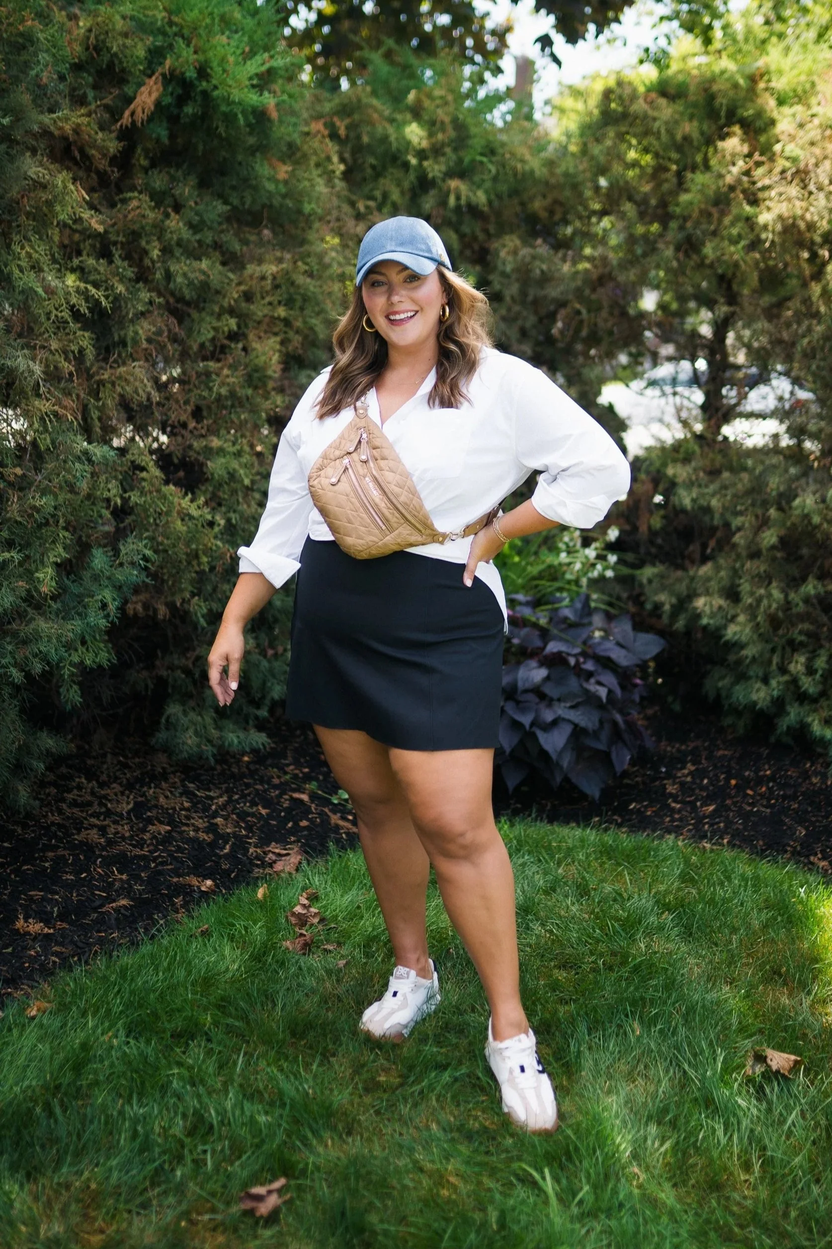 You can never go wrong with the classics… a crisp poplin button-up and a baseball cap always deliver. I layered a white shirt over the skort, added sneakers and a denim cap, and topped it off with a belt bag to keep things easy and hands-free. It’s the kind of outfit that feels effortlessly cool but still put-together, perfect for a casual coffee run or a weekend stroll.