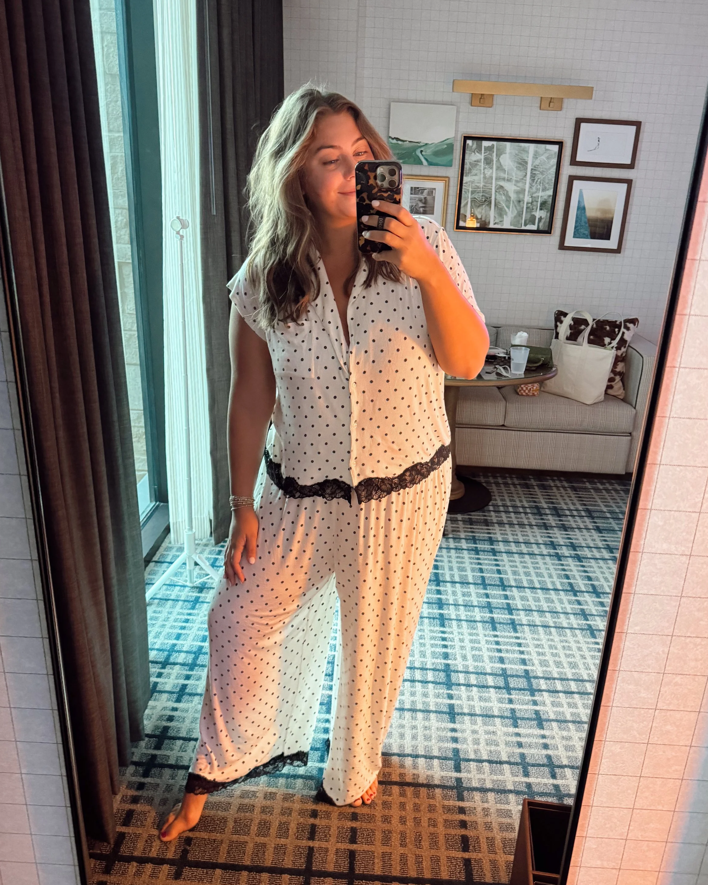 Day two called for snappy casual, and I took it as the perfect opportunity to mix business-casual structure with a fun, on-trend twist. Think: effortless layers, elevated staples, and pieces that felt like me. The evening vibe? Parisian-inspired perfection. From bold lips to classic details, it felt like a grown-up dress-up moment in the best way. And yes… I’m also sharing the pajamas I wore that night, because they deserve their moment too.