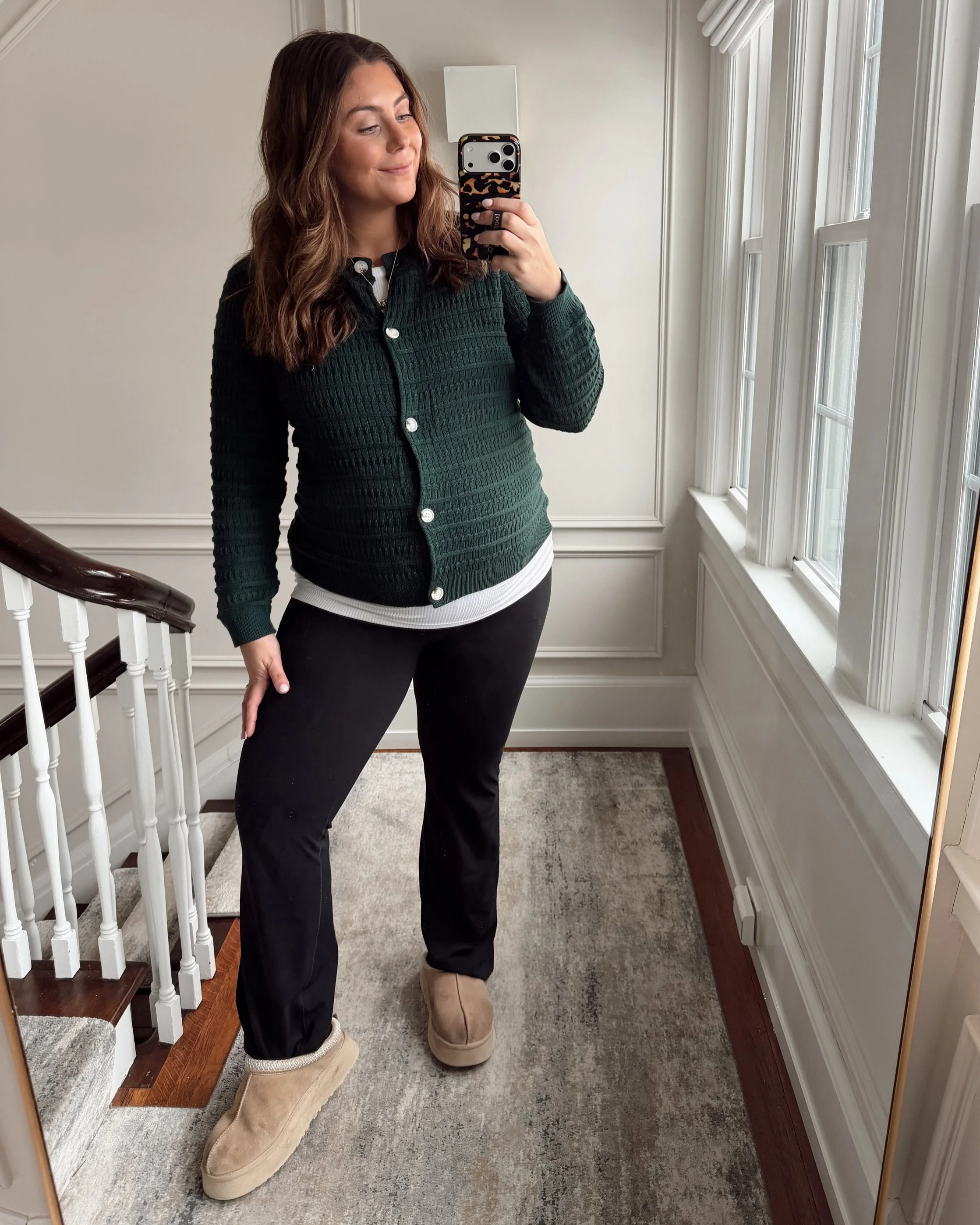 A lightweight cotton cardigan that’s perfect for layering. I own it in blue and liked it enough to pick it up in green as well. It runs generously, I’m wearing an XL with a bump, and I still have plenty of room. See full outfit details here.