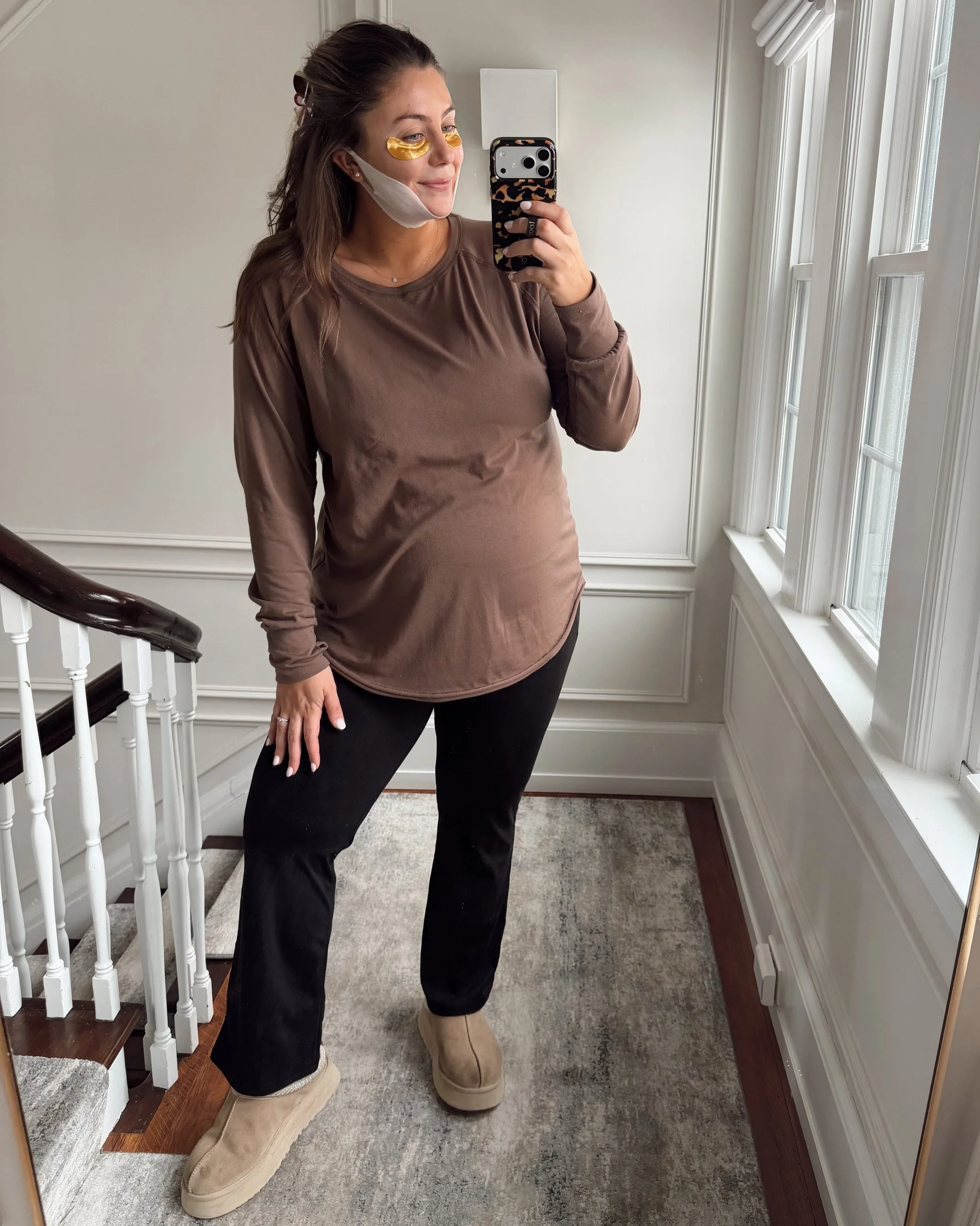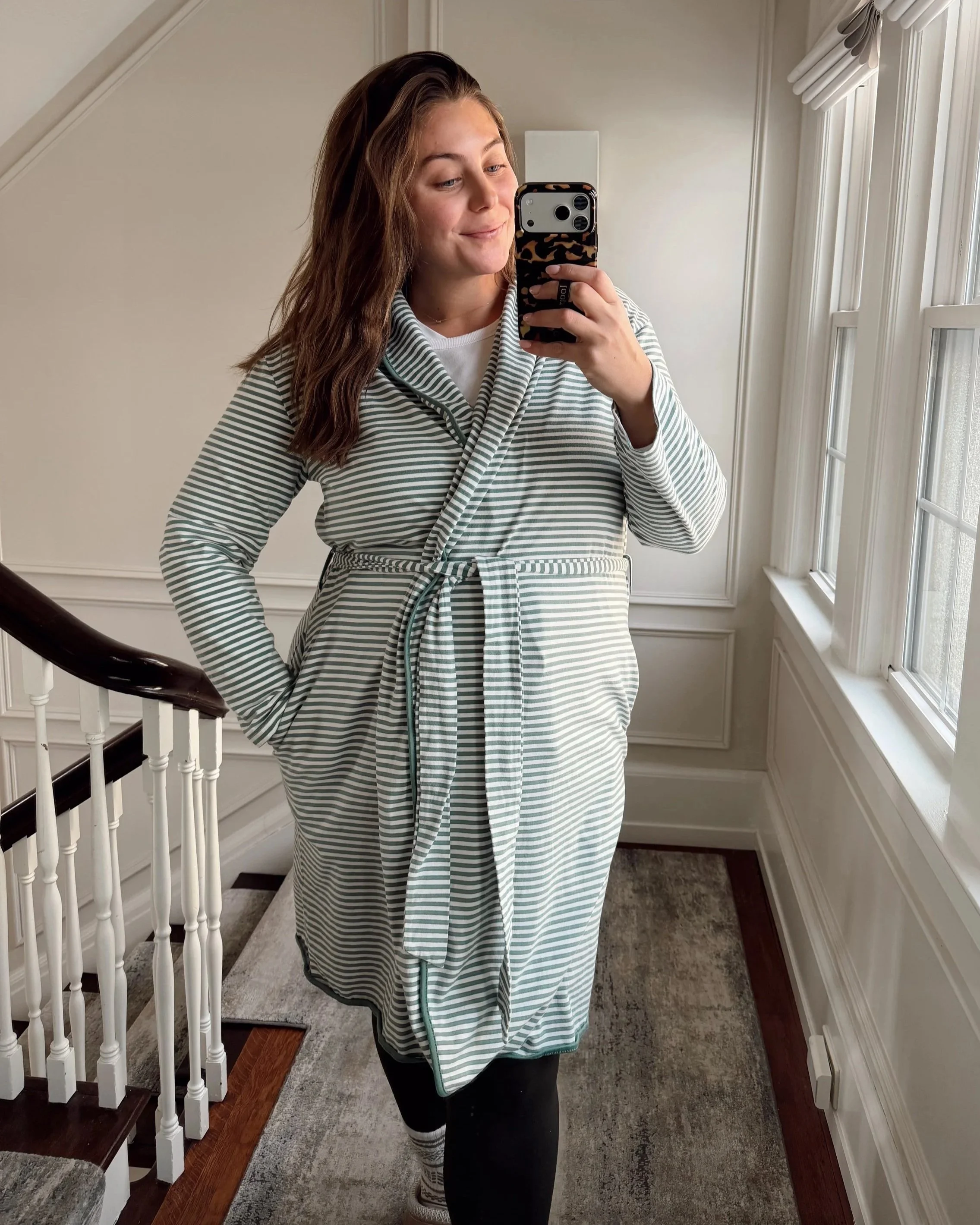 A great look-for-less of a very popular robe that usually runs well over $100. This version is nearly identical, just with a bit more stretch to it. Their pajamas linked here are really good too; everything is non-maternity but bump-friendly, and I got all XXL.
