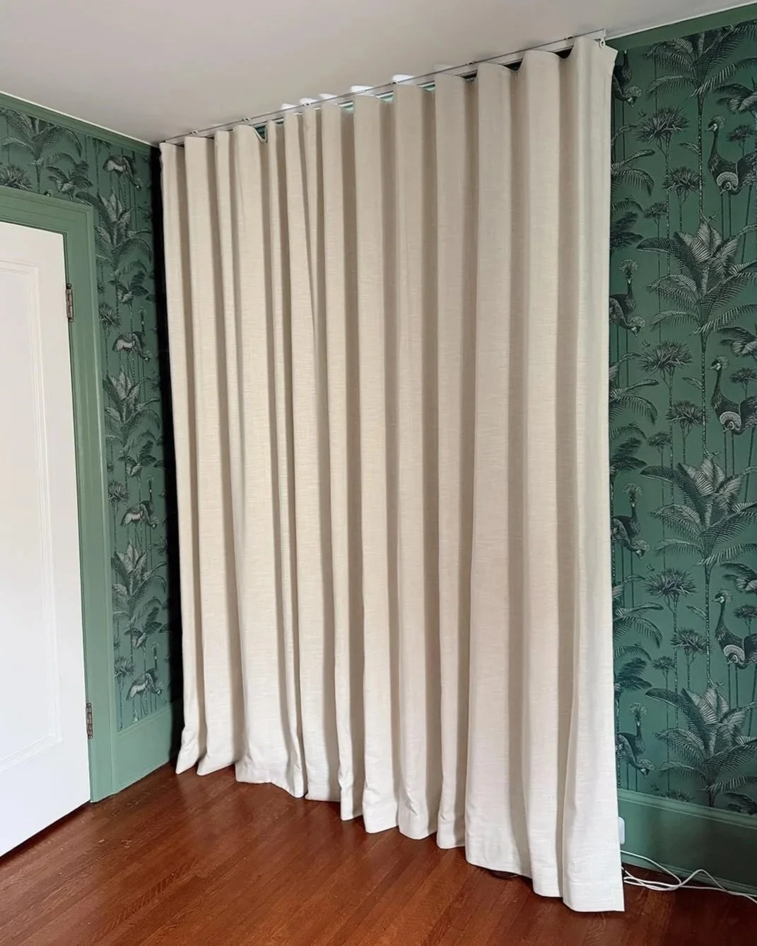 See everything I used here. My exact customizations were: ivory white fabric, ceiling mount, inflexible track with custom track length, a single panel for the door and a pair for the window, 240gsm 100% blackout, no tiebacks, and memory shaping.